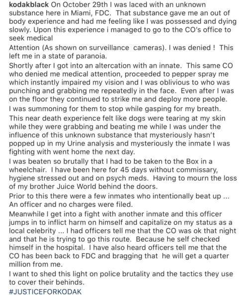 Kodak Black Claims He Was ‘Laced With An Unknown Substance’ While In Prison & Beat By Correctional Officers
