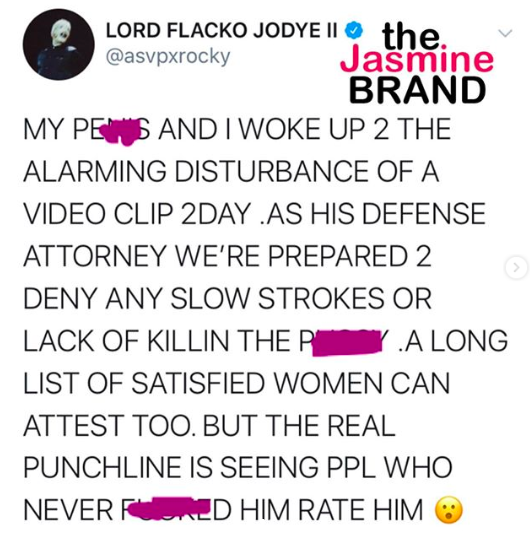 “My p***s and I woke up 2 the alarming disturbance of a video clip 2day. As his defense attorney we’re prepared 2 deny any slow strokes or lack of killin the p***y. A long list of satisfied women can attest too. But the real punchline is seeing ppl who never f***ed him rate him”