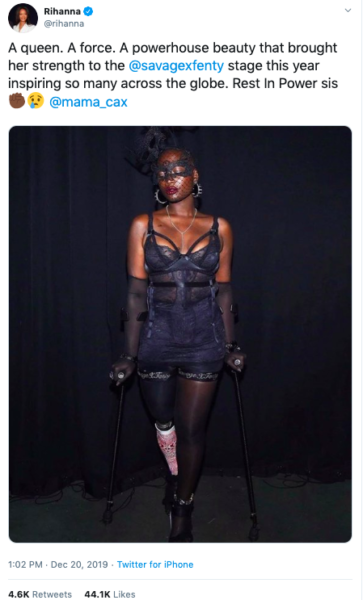 “A queen. A force. A powerhouse beauty that brought her strength to the @savagexfentystage this year inspiring so many across the globe. Rest In Power sis”