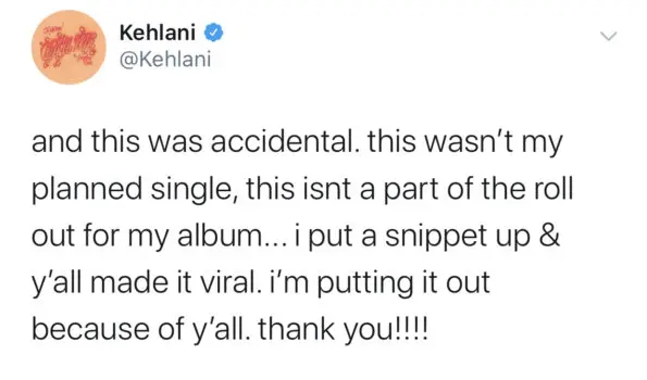 “and this was accidental. this wasn’t my planned single, this isnt a part of the roll out for my album… i put a snippet up & y’all made it viral. i’m putting it out because of y’all. thank you!!!!”