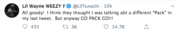 All goody! I think they thought I was talking abt a different “Pack” in my last tweet. But anyway GO PACK GO!!!