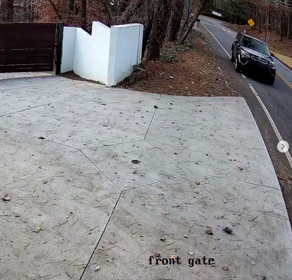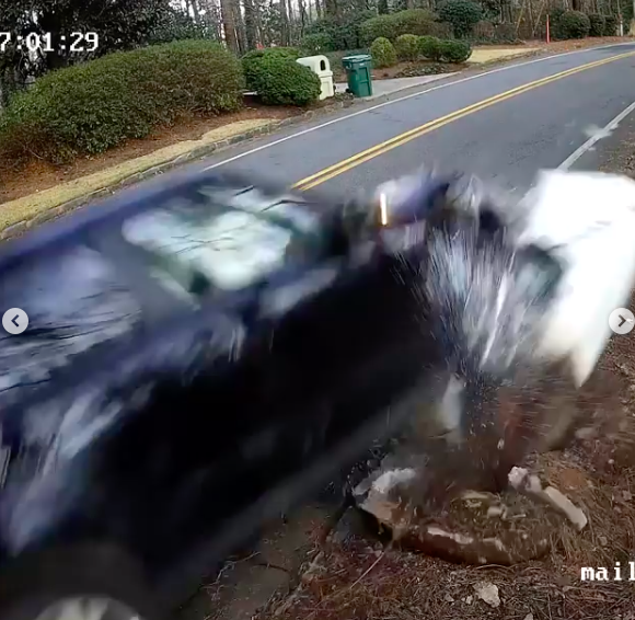 The first part of the clip, caught by Kenya Moore’s security cameras, shows a car veering off of the road, but the second portion shows it crashing head-on into her cement mailbox.