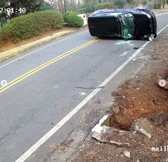 “@thebrooklyndaly and I went to the park and came back to find my cement mailbox on the side of the road. I searched my cameras and saw this!!! We have speed bumps right outside my house. After cutting the roof of the car off the driver was ok. Just to think yesterday I took her out in her new stroller along my street. Thank you God for your protection.”