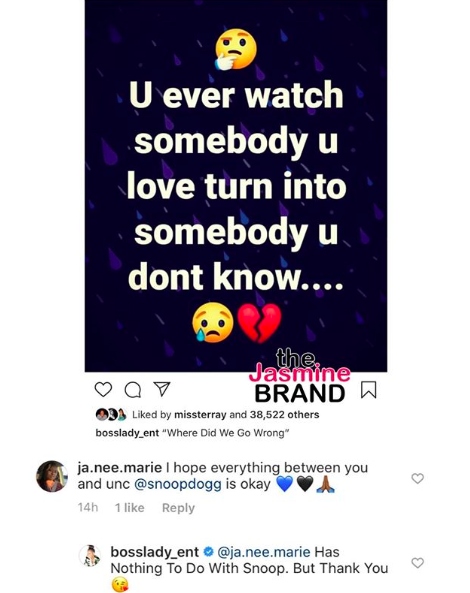 Fans naturally showed concern over the status of her marriage to the Dog Father. Instagram user @ja.nee.marie commented,