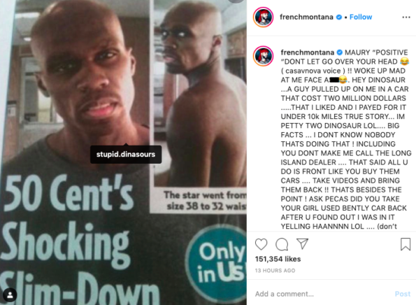 He shared a throwback photo of 50 Cent’s shocking weight loss back in 2010. He wrote a lengthy caption and revealed his car cost $2 million and added that he heard 50 Cent only borrows luxury cars to stunt and then returns them. He spoke on a rumor that 50 Cent returned a girlfriend’s used Bentley after 50 Cent found out French Montana was in it. He also alleged 50 Cent went bankrupt five times.