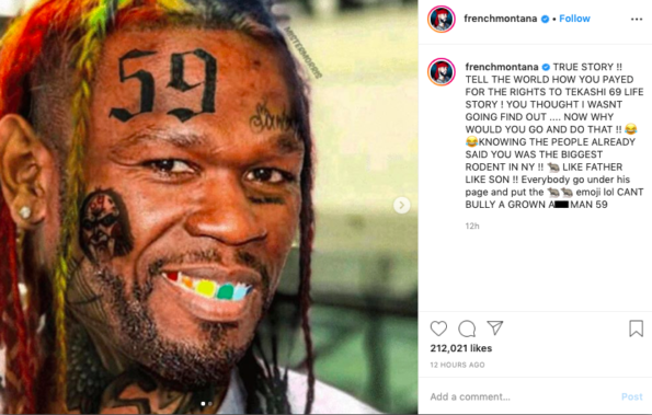 “TRUE STORY !! TELL THE WORLD HOW YOU PAYED FOR THE RIGHTS TO TEKASHI 69 LIFE STORY ! YOU THOUGHT I WASNT GOING FIND OUT …. NOW WHY WOULD YOU GO AND DO THAT !! ??KNOWING THE PEOPLE ALREADY SAID YOU WAS THE BIGGEST RODENT IN NY !! ? LIKE FATHER LIKE SON !! Everybody go under his page and put the ?? emoji lol CANT BULLY A GROWN A** MAN 59”