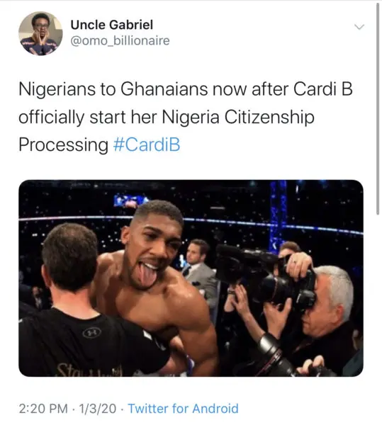 “Since cardi B want to come and enjoy her Nigeria citizenship lemme name her from Chioma B to “Adaku””