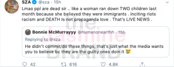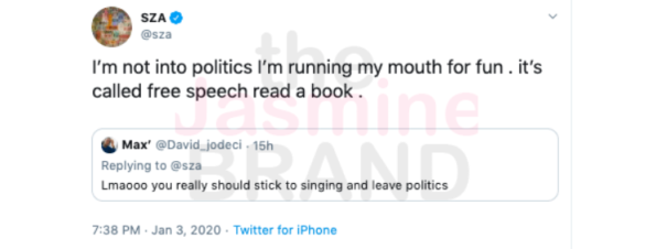 She also responded to a critic who said she needs to stick to singing and stay out of politics. Sza tweeted,