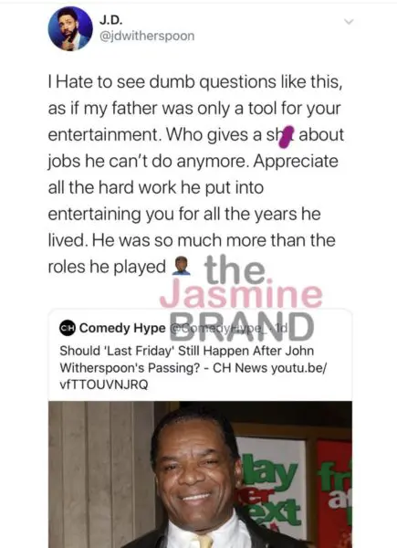 Late comedian John Witherspoon’s son, JD Witherspoon took to Twitter on Friday (Jan. 3rd), responding to questions surrounding the highly anticipated sequel to the last installment of Ice Cube’s ‘Friday’ films. The comedian’s son says he’s growing weary of the conversations about the future of any film his late father has been apart of,