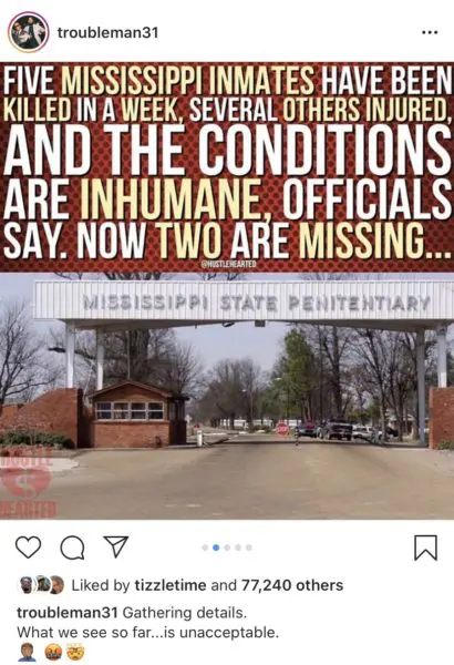 “The death toll at Parchman continues to rise. How long must we wait for Mississippi lawmakers to address this crisis? CALL NOW: 888-887-9480…FIVE MISSISSIPPI INMATES HAVE BEEN KILLED IN A WEEK, SEVERAL OTHERS INJURES, AND THE CONDITIONS ARE INHUMANE, OFFICIALS SAY. NOW TWO ARE MISSING…”
