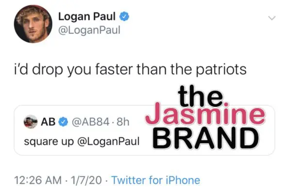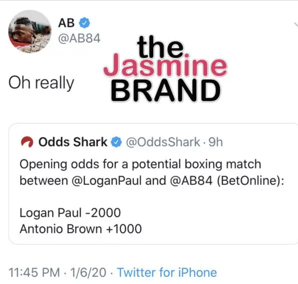 It looks like ex-NFL star Antonio Brown wants to take his frustrations out on YouTube star, Logan Paul. He challenged Logan Paul to a boxing match via Twitter Monday (Jan. 6th). Logan Paul, who recently completed what he called a life-changing experience training with two U.S. Navy Seals, was called out after AB notice an online betting account gave an early advantage to the YouTube star. AB responded,