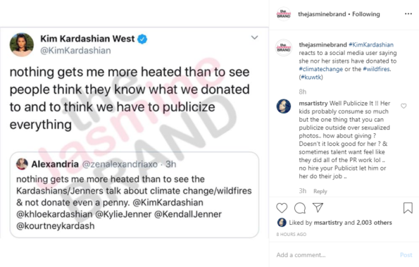 As we previously reported, one social media user even directly challenged the Kardashian/Jenner family for failing to publicize any donations to fire relief efforts. Kim Kardashian didn’t let the comment slide. She said: