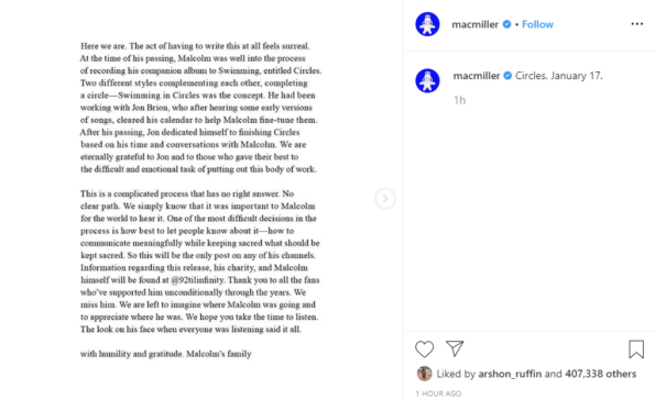 Mac’s estate released a statement via his official Instagram page to announce his first posthumous album, Circles. The announcement read: