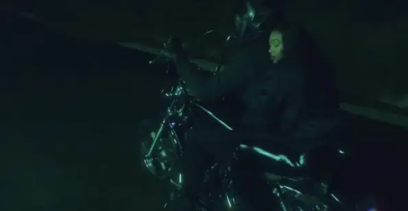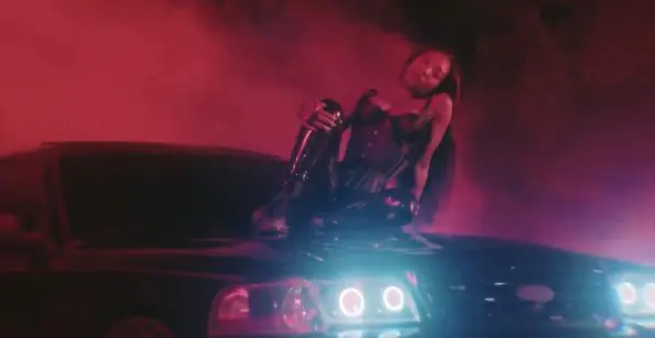 Walker goes on as she sings seductively on the back of a motorcycle gripping her man to the hood of a car in black latex pants and a matching corset.