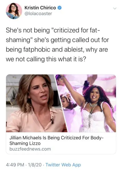 .@JillianMichaels on Lizzo: "Why are we celebrating her body? Why does it matter? Why aren't we celebrating her music? 'Cause it isn't gonna be awesome if she gets diabetes." pic.twitter.com/FkKBd8J87b