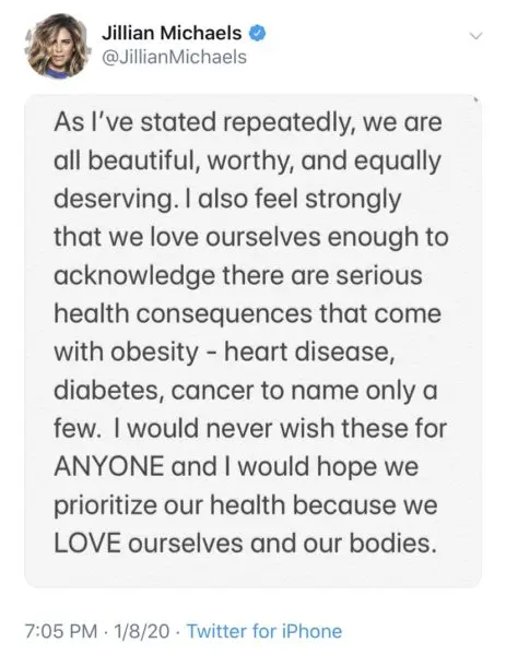 Jillian Michaels, later, responded with this unapologetic statement about her comments: