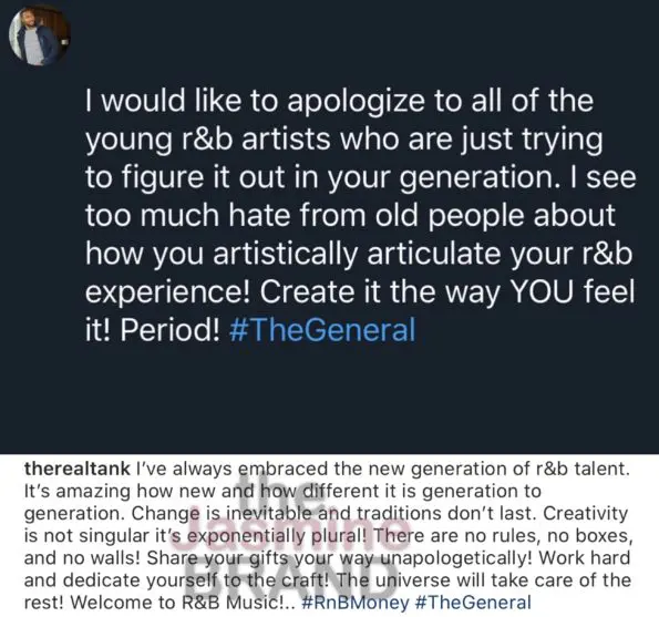 “I would like to apologize to all of the young r&b artists who are just trying to figure it out in your generation. I see too much hate from old people about how you artistically articulate your r&b experience! Create it the way YOU feel it! Period! #TheGeneral”