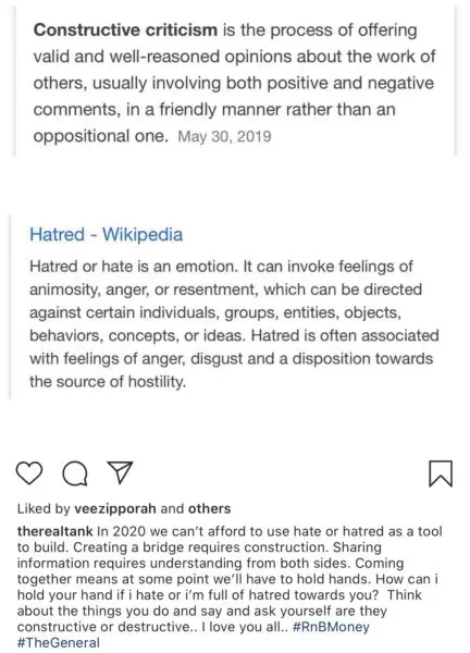“In 2020 we can’t afford to use hate or hatred as a tool to build. Creating a bridge requires construction. Sharing information requires understanding from both sides. Coming together means at some point we’ll have to hold hands. How can i hold your hand if i hate or i’m full of hatred towards you? Think about the things you do and say and ask yourself are they constructive or destructive.. I love you all.. #RnBMoney #TheGeneral“