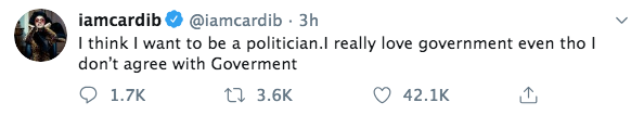 Cardi B may be taking a pivot in her career. The 27-year-old rapper is officially expressing an interest in politics. On Sunday (Jan. 12th), Cardi B tweeted: