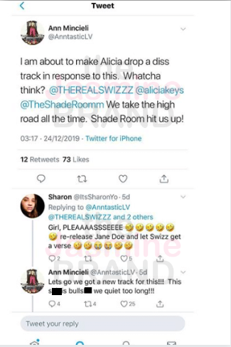 She also shared tweets from Alicia Keys’ engineer Ann Mincieli, who suggested that Alicia Keys would be dropping a diss track.