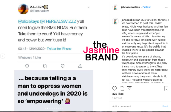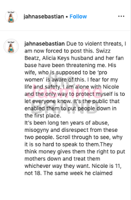 “Due to violent threats, I am now forced to post this. Swizz Beatz, Alicia Keys husband and her fan base have been threatening me. His wife, who is supposed to be ‘pro women’ is aware of this. I fear for my life and safety. I am alone with Nicole and the only way to protect myself is to let everyone know. It’s the public that enabled them to put people down in the first place.”