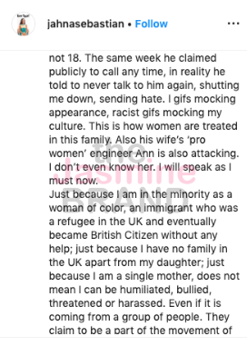 “Just because I am in the minority as a woman of color, an immigrant who was a refugee in the UK and eventually became British Citizen without any help; just because I have no family in the UK apart from my daughter; just because I am a single mother, does not mean I can be humiliated, bullied, threatened or harassed. Even if it is coming from a group of people. They claim to be a part of the movement of women empowerment.”