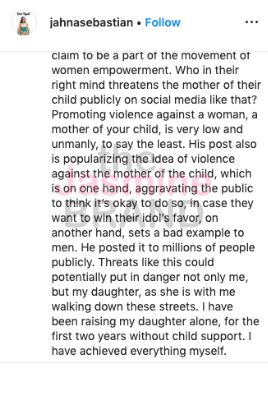 “Who in their right mind threatens the mother of their child publicly on social media like that? Promoting violence against a woman, a mother of your child, is very low and unmanly, to say the least. His post also is popularizing the idea of violence against the mother of the child, which is on one hand, aggravating the public to think it’s okay to do so, in case they want to win their idol’s favor, on another hand, sets a bad example to men. He posted it to millions of people publicly. Threats like this could potentially put in danger not only me, but my daughter, as she is with me walking down these streets. I have been raising my daughter alone, for the first two years without child support. I have achieved everything myself.”