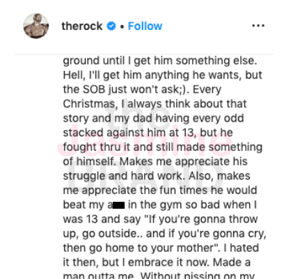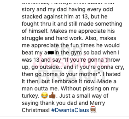 “Over the years, I’ve moved him into a big home, got him trucks to drive – which he’ll literally drive into the ground until I get him something else. Hell, I’ll get him anything he wants, but the SOB just won’t ask;). Every Christmas, I always think about that story and my dad having every odd stacked against him at 13, but he fought thru it and still made something of himself. Makes me appreciate his struggle and hard work. Also, makes me appreciate the fun times he would beat my ass in the gym so bad when I was 13 and say “If you’re gonna throw up, go outside.. and if you’re gonna cry, then go home to your mother”. I hated it then, but I embrace it now. Made a man outta me. Without pissing on my turkey. ???. Just a small way of saying thank you dad and Merry Christmas! #DwantaClaus??“
