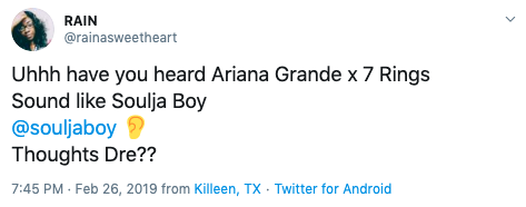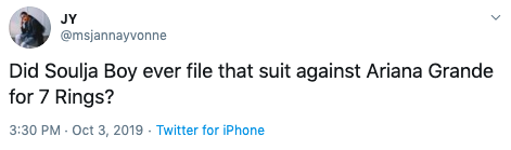 While she’s now being sued for her hit song, Soulja Boy isn’t the one who filed the lawsuit. instead, it was Josh Stone, whose stage name is DOT. He said he wrote and performed “You Need It I Got It” back in 2017, and said that he delivered the song to those high up in the music industry, some who work closely with Ariana Grande.