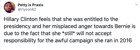 “Well, number one, I think [that sentiment] is untrue, which we should all say loudly. I mean, I did get more votes both in the primary, by about 4 million, and in the general election, by about 3 million. I think that both the press and the public have to really hold everybody running accountable for what they say and what their campaign says and does. That’s particularly true with what’s going on right now with the Bernie campaign having gone after Elizabeth with a very personal attack on her. Then this argument about whether or not or when he did or didn’t say that a woman couldn’t be elected, it’s part of a pattern. If it were a one-off, you might say, “OK, fine.” But he said I was unqualified. I had a lot more experience than he did, and got a lot more done than he had, but that was his attack on me. I just think people need to pay attention because we want, hopefully, to elect a president who’s going to try to bring us together, and not either turn a blind eye, or actually reward the kind of insulting, attacking, demeaning, degrading behavior that we’ve seen from this current administration.”