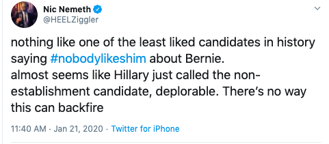 Y’all Hillary Clinton didn’t say anything about Bernie Sanders that he hasn't said about himself. He’s not there to get along w/people; he’s not there to "wish someone a happy birthday". He admits, proudly, that he’s kind of a jerk. #NobodyLikesHim pic.twitter.com/tJnNU83QLX https://t.co/QBLAKsWQFt