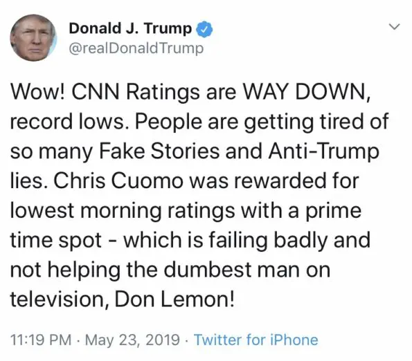This isn’t Trump’s first time airing his grievances for Lemon on social media. In fact, last May he used the exact same phrase, calling Don Lemon “the dumbest man on TV” due to his criticism of Trump walking out of a meeting with Speaker of the House Nancy Pelosi.