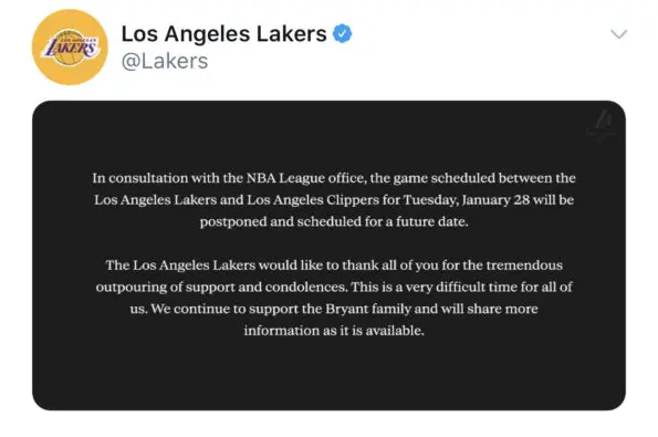 In agreement with the league, the Lakers also released a statement on the postponement of Tuesday’s game. The team also thanks fans for their outpouring support throughout this tragic time.