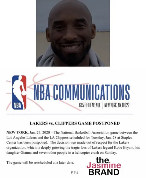 Just 24-hours after the devastating news of the death of Los Angeles Lakers legend Kobe Bryant, the NBA announced the headlining Tuesday (Jan. 28th), Lakers-Clippers game will be postponed. In a statement released on Monday (Jan. 27th), the league says it plans to show the upmost respect for Kobe, his 13-year-old daughter, Gianna Bryant and the seven other victims on Tuesday.