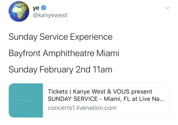 In his Tweet, Kanye shares the location of his worship service which begins at 11am EST as the 42-year-old will be partnering with Miami’s VOUS church at the FPL Solar Amphitheater at Bayfront Park.