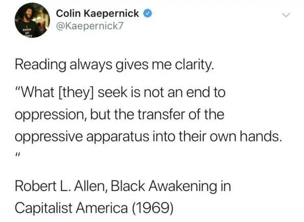 Shortly after the announcement, former NFL quarterback and activist Colin Kaepernick took to social media and seemingly addressed their partnership. In Kaepernick’s message, the former NFL’er shared a poem by Robert L. Allen, quoting from “Black Awakening.”