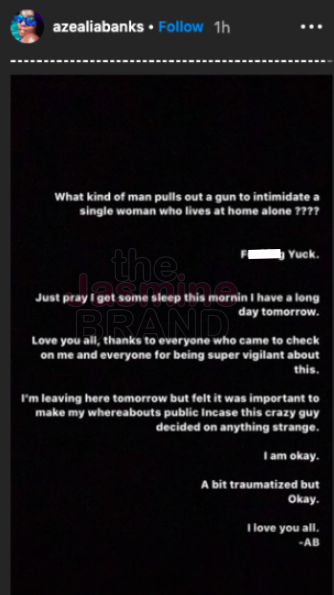 “What kind of man pulls out a gun to intimidate a single woman who lives at home alone ???? F*cking yuck. Just pray I get some sleep this mornin I have a long day tomorrow. Love you all, thanks to everyone who came to check on me and everyone for being super vigilant about this. I’m leaving here tomorrow but felt it was important to make my whereabouts public incase this crazy guy decided on anything strange. I am okay. A bit traumatized but Okay. I love you all. -AB”