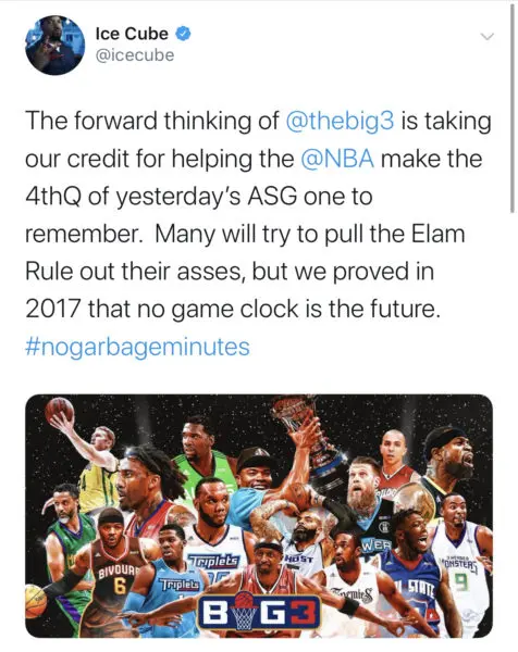 “The forward thinking of? The Big 3 is taking our credit for helping the NBA make the 4thQ of yesterday’s ASG one to remember. Many will try to pull the Elam Rule out their asses, but we proved in 2017 that no game clock is the future”