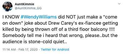 #WendyWilliams is receiving some backlash for a joke she made while reporting on the death of #DrewCarey’a ex #AmieHarwick pic.twitter.com/WytXa9uII1