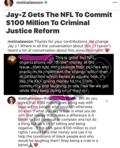 Tina Lawson Defends Jay-Z After Troll Compares NFL To The KKK: Stop Being A Crab In A Barrel