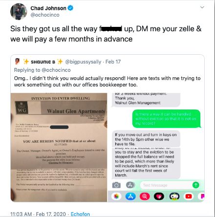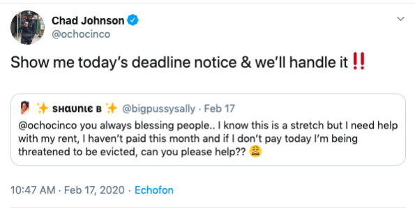 “@ochocinco you always blessing people.. I know this is a stretch but I need help with my rent, I haven’t paid this month and if I don’t pay today I’m being threatened to be evicted, can you please help??”
