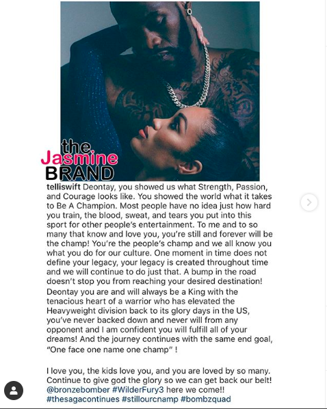 “I love you, the kids love you, and you are loved by so many. Continue to give god the glory so we can get back our belt! @bronzebomber#WilderFury3 here we come!! #thesagacontinues#stillourchamp#bombzquad“