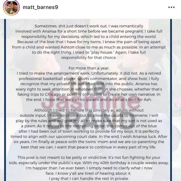 Matt Barnes goes on to write his plans of taking legal action to maintain a relationship with their son.