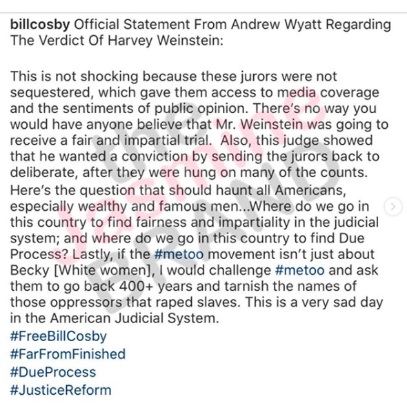 Andrew Wyatt released a statement via Bill Cosby’s Instagram page and said the judge pushed for Harvey Weinstein to be convicted.