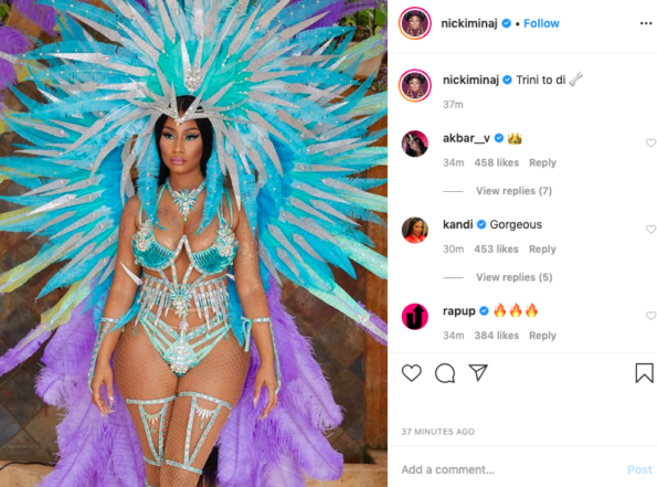 It doesn’t look like Nicki Minaj is carrying her first little one just yet. The “Megatron” rapper shared a video rocking her Trinidad Carnival costume on Instagram Tuesday (Feb. 25).