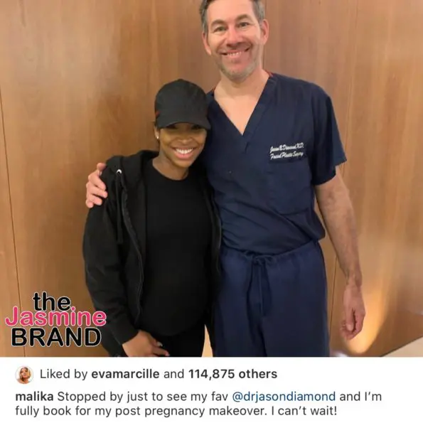Reality star, Malika Haqq is ready to pop! On Tuesday (Feb. 25th), the ‘Keeping Up With The Kardashians,’ star shared her plans to snap back for the summer as she prepares to give birth to her first child. Malika, 36, snapped a quick photo with a make-up free face along with a celebrity plastic surgeon, Dr. Jasom Diamond who has appeared on shows such as Dr. 90210 and The Celebrity Plastic Surgeons of Beverly Hills. The mother-to-be writes,