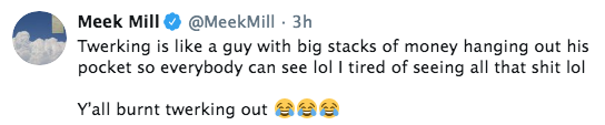 Meek Mill (real name Robert Rihmeek Williams) has officially had enough of the twerking. The 32-year-old rapper expressed these exact sentiments recently on social media. Today (Feb. 27th), Meek Mill tweeted: