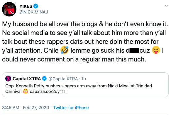 Nicki Minaj also headed to Twitter to share her thoughts and responded to a video of Kenneth Petty seeming to push someone’s arm away from Nicki Minaj while they were at Trinidad Carnival.