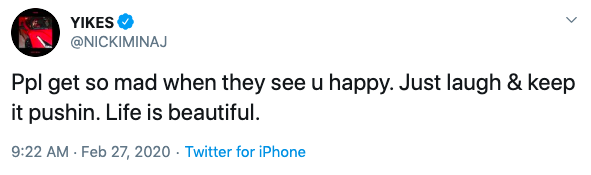 “Ppl get so mad when they see u happy. Just laugh & keep it pushin. Life is beautiful.”