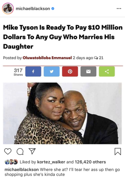 Comedian Michael Blackson loves a good roast session, as long as it’s at his opponent’s expense. But he may have recently met his match! The Ghana native decided to make one of boxing legend, Mike Tyson‘s, daughters the butt of his latest joke on Instagram, screenshotting a spam site’s headline, which read:
